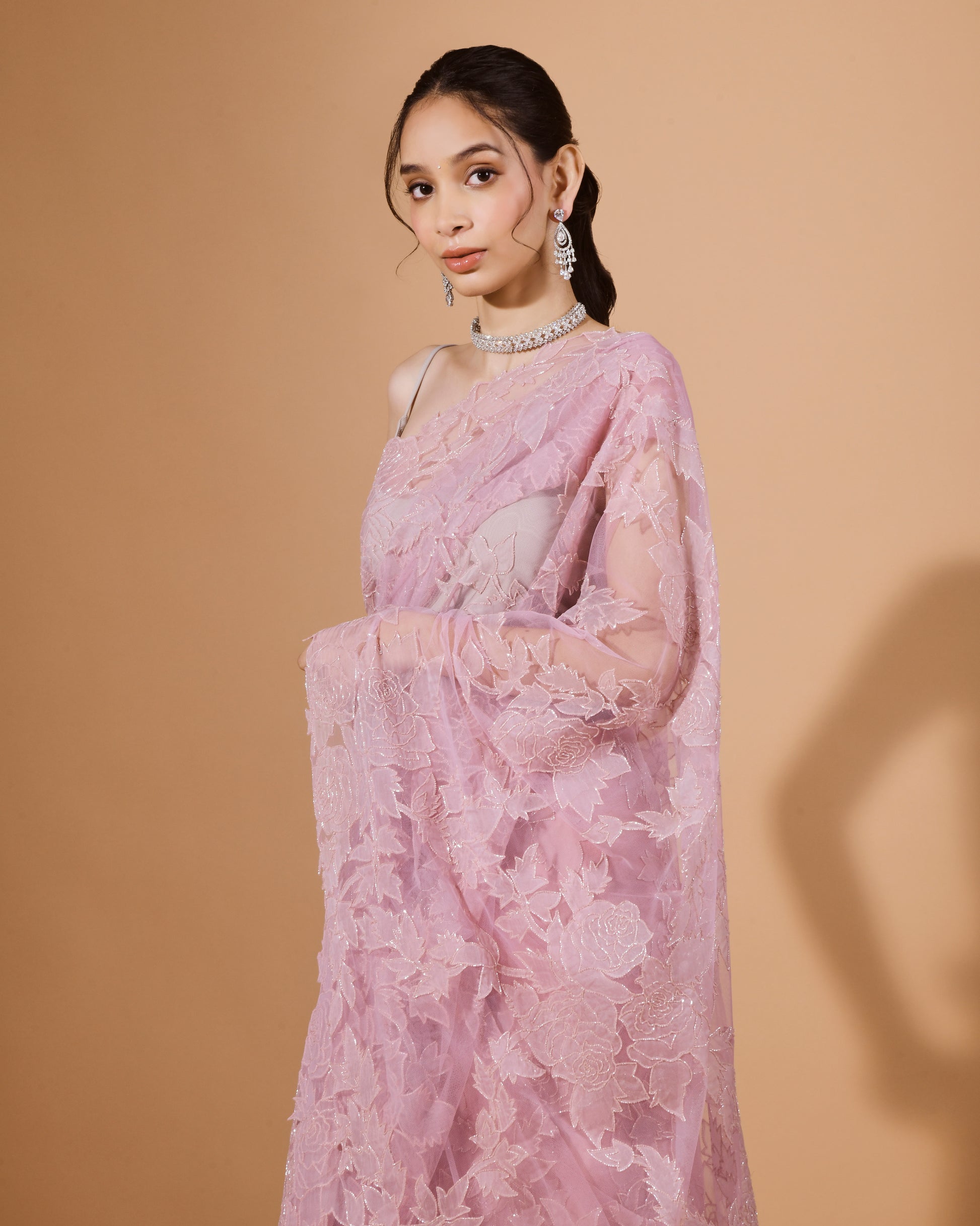 The Rosetta Appliqué Saree embodies poetic elegance through intricate craftsmanship. Crafted from soft net, it features hand-appliquéd rose motifs that bring depth, texture, and feminine charm to the sheer drape.