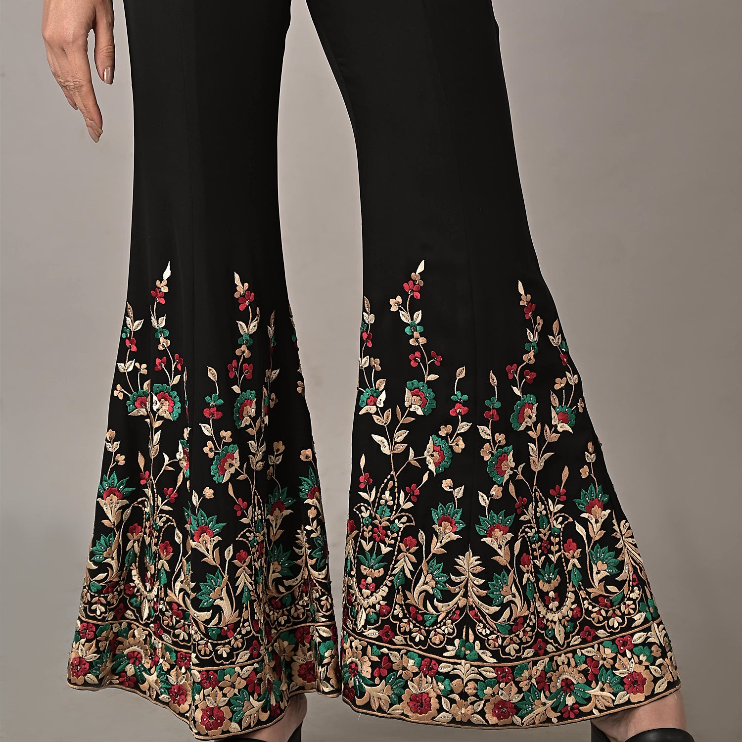 Details: Handcrafted Parsi Gara Embroidery | Wide-Leg Silhouette | Fluid Drape