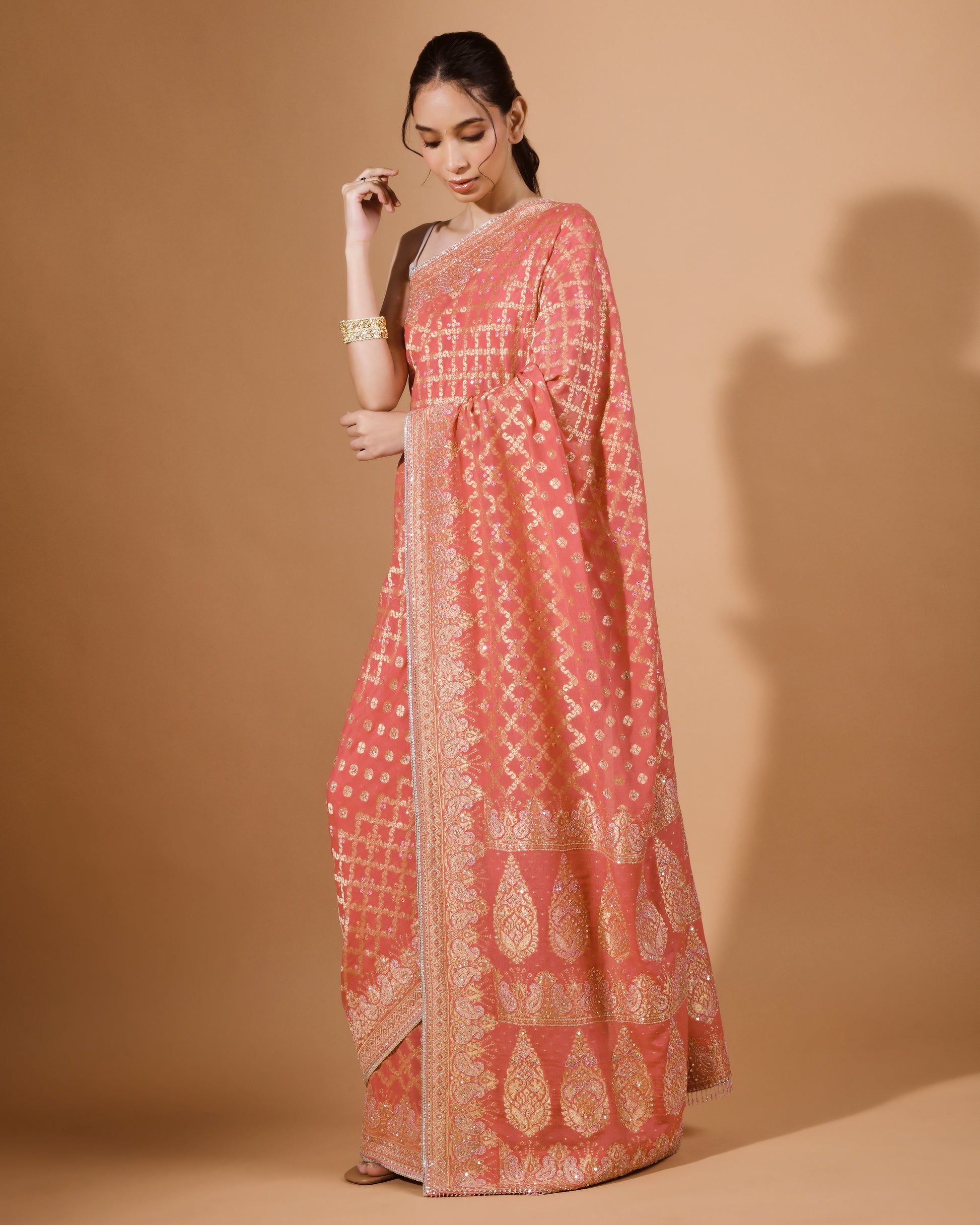 Draped in a rich tomato hue, it radiates warmth and sophistication — a perfect balance of culture and contemporary grace.